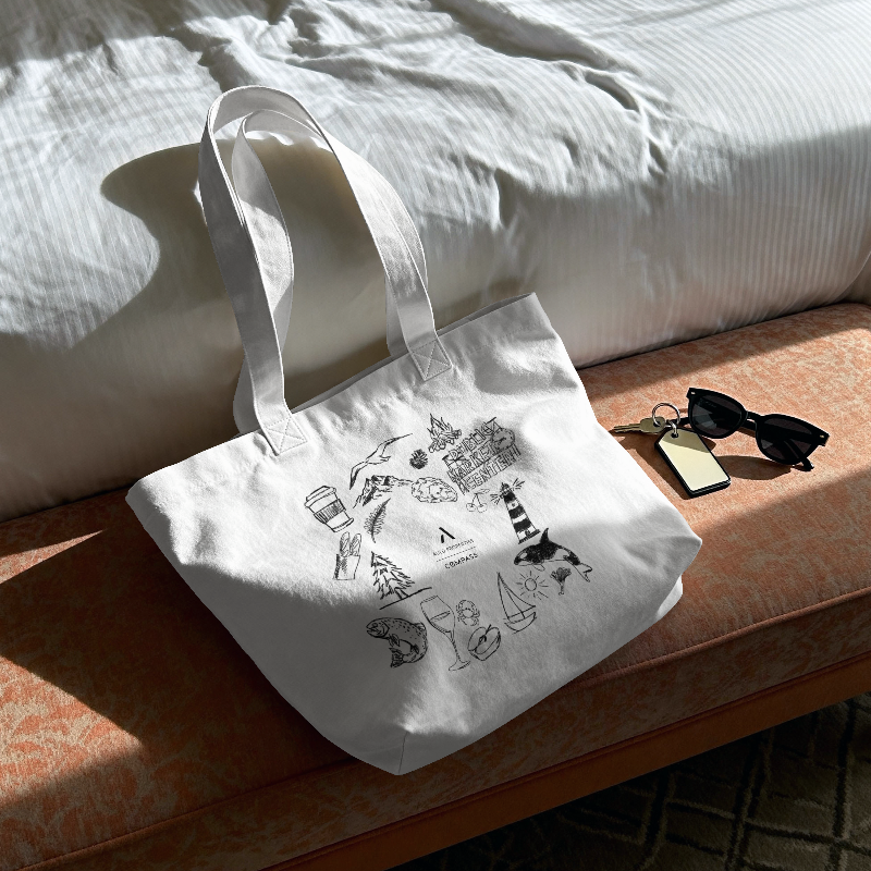 The tote bag design highlights iconic Pacific Northwest elements to celebrate the region’s unique outdoorsy vibe.